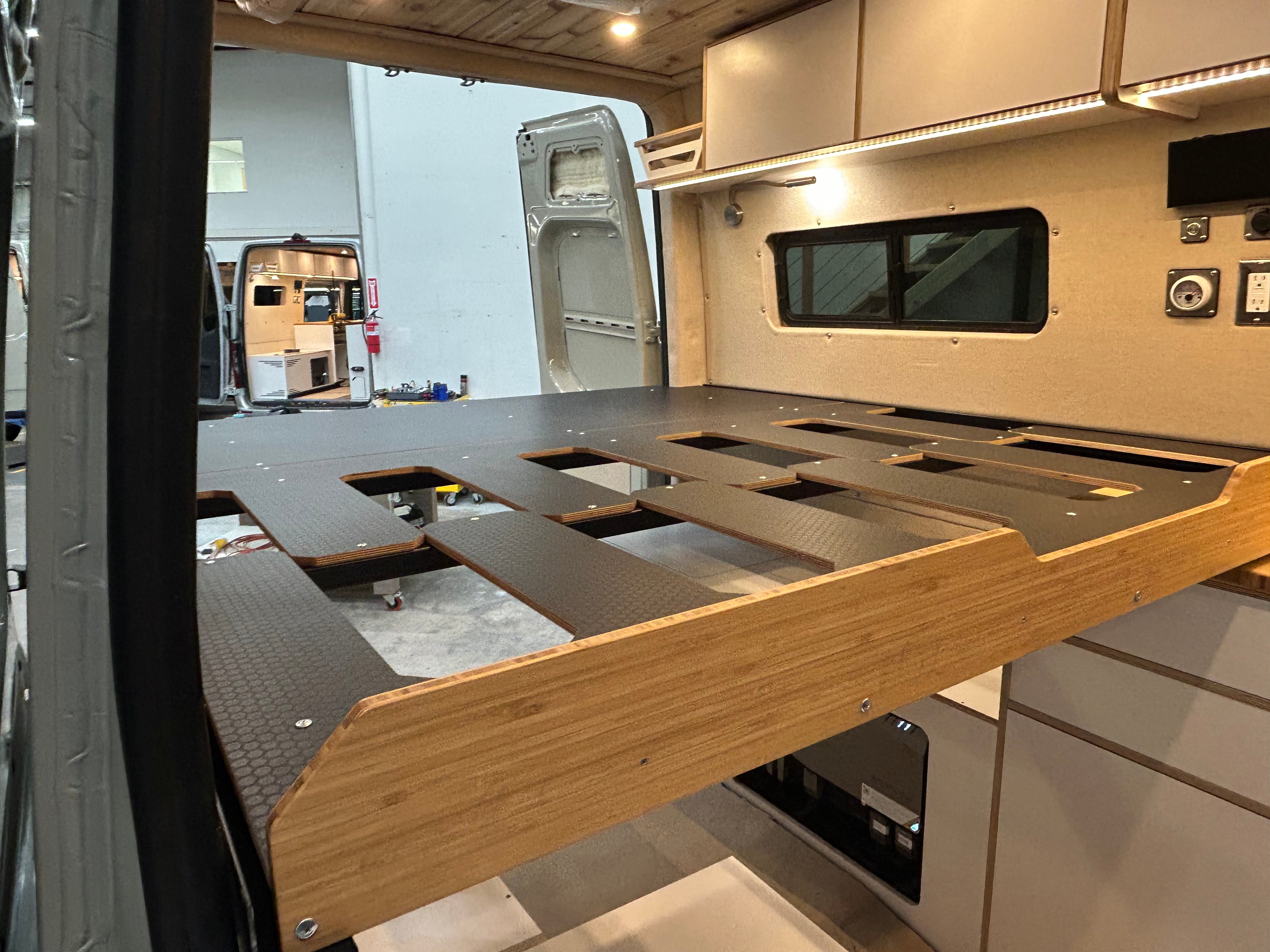 Description: Designed specifically for the Mercedes-Benz Sprinter 170, our Versabed system delivers a clean, modular sleeping solution that balances strength, simplicity, and refined design. Engineered around the factory wall contours, the system mounts to the rear interior metal structure using precision-fit steel braces, creating a solid foundation without unnecessary bulk. Steel angle rails attach to these braces to form the primary bed frame, while cross bars with integrated heavy-duty Velcro provide a secure, stable platform that resists shifting during use. The Versabed is available in our durable Hex-Ply material for a rugged, lightweight build, or upgraded to Amber Bamboo for a more premium aesthetic. Designed with versatility in mind, the platform is fully adjustable—measuring approximately 59.5" x 66.5" in its compact configuration to maximize interior space, and extending to 79.5" in length when fully deployed for a comfortable sleeping surface. The kit ships as a straightforward DIY system with clearly labeled components and easy-to-follow instructions, making installation approachable and efficient. Predrilled mounting points set the bed height at approximately 37" off the factory floor, intentionally aligned with our galley cabinet height to ensure no interference, while still allowing up to ~10" of vertical adjustability if you choose to customize. The system is also easily removable, allowing you to quickly return to full floor-to-ceiling cargo space when needed. Minimal, sturdy, and highly functional, the Versabed is built to integrate seamlessly into your Sprinter 170 layout.