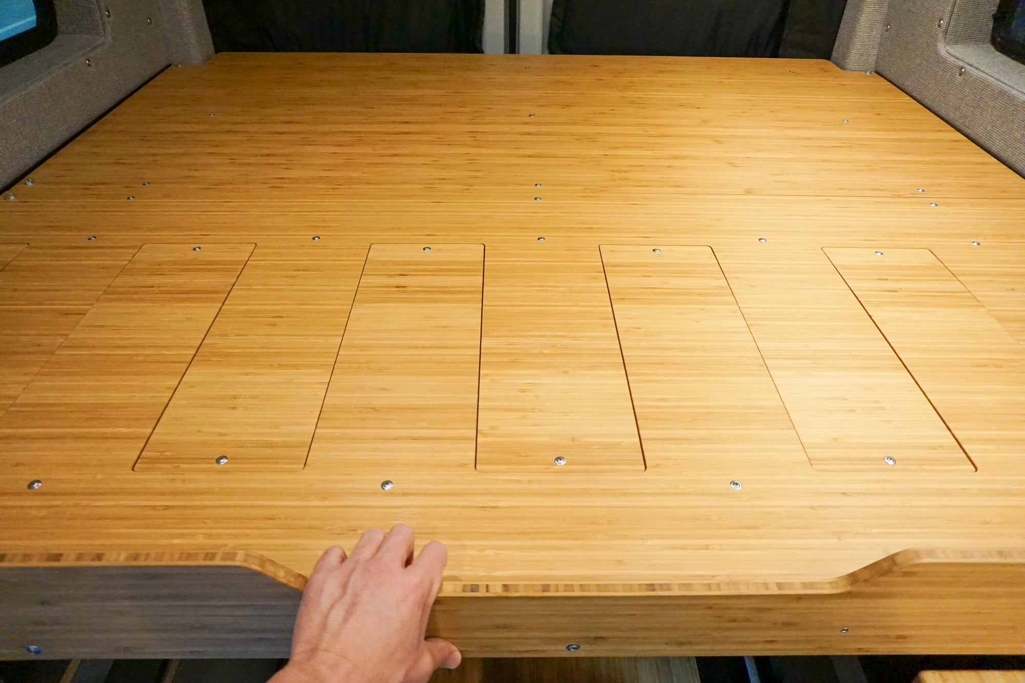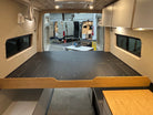 Description: Designed specifically for the Ford Transit 148 Extended High Roof, our Versabed system delivers a clean, modular sleeping solution that balances strength, simplicity, and refined design. Engineered around the factory wall contours, the system mounts to the rear interior metal structure using precision-fit steel braces, creating a solid foundation without unnecessary bulk. Steel angle rails attach to these braces to form the primary bed frame, while cross bars with integrated heavy-duty Velcro provide a secure, stable platform that resists shifting during use. The Versabed is available in our durable Hex-Ply material for a rugged, lightweight build, or upgraded to Amber Bamboo for a more premium aesthetic. Designed with versatility in mind, the platform is fully adjustable—measuring approximately 59.5" x 66.5" in its compact configuration to maximize interior space, and extending to 79.5" in length when fully deployed for a comfortable sleeping surface. The kit ships as a straightforward DIY system with clearly labeled components and easy-to-follow instructions, making installation approachable and efficient. Predrilled mounting points set the bed height at approximately 37" off the factory floor, intentionally aligned with our galley cabinet height to ensure no interference, while still allowing up to ~10" of vertical adjustability if you choose to customize. The system is also easily removable, allowing you to quickly return to full floor-to-ceiling cargo space when needed. Minimal, sturdy, and highly functional, the Versabed is built to integrate seamlessly into your Transit 148 Extended layout.